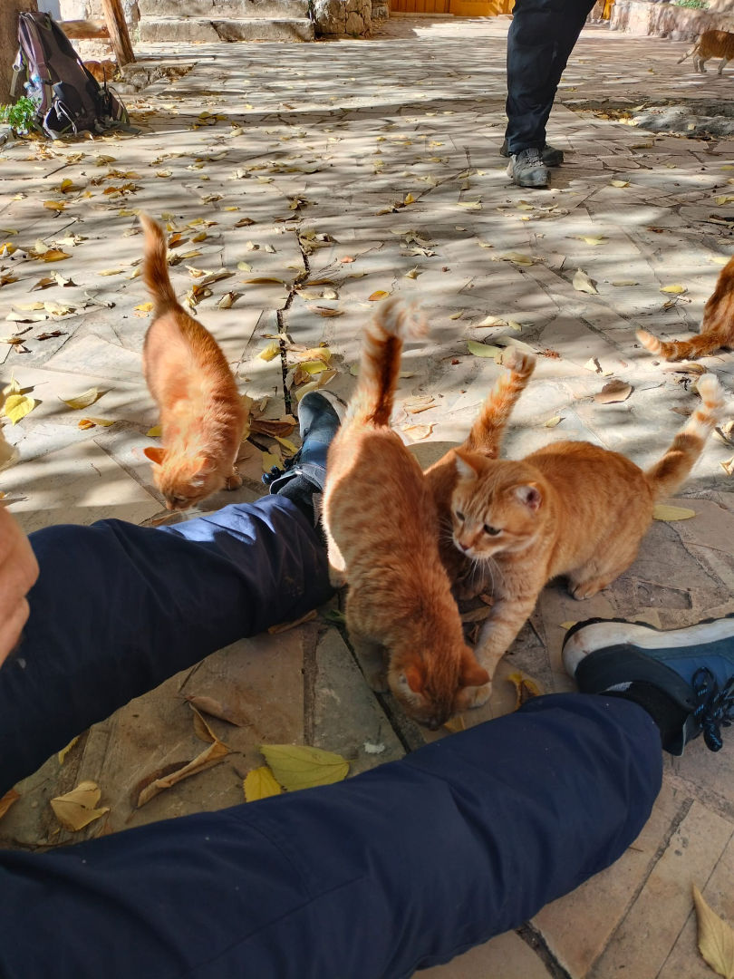 We were surrounded by a family of six cats—a mother and her kittens—who quickly became our dining companions. Despite sharing small bites, the highlight (or lowlight, depending on whose bag it was!) came when one sneaky kitten, deciding small bites weren’t enough, skillfully snagged a fully wrapped sandwich and made a swift escape!
